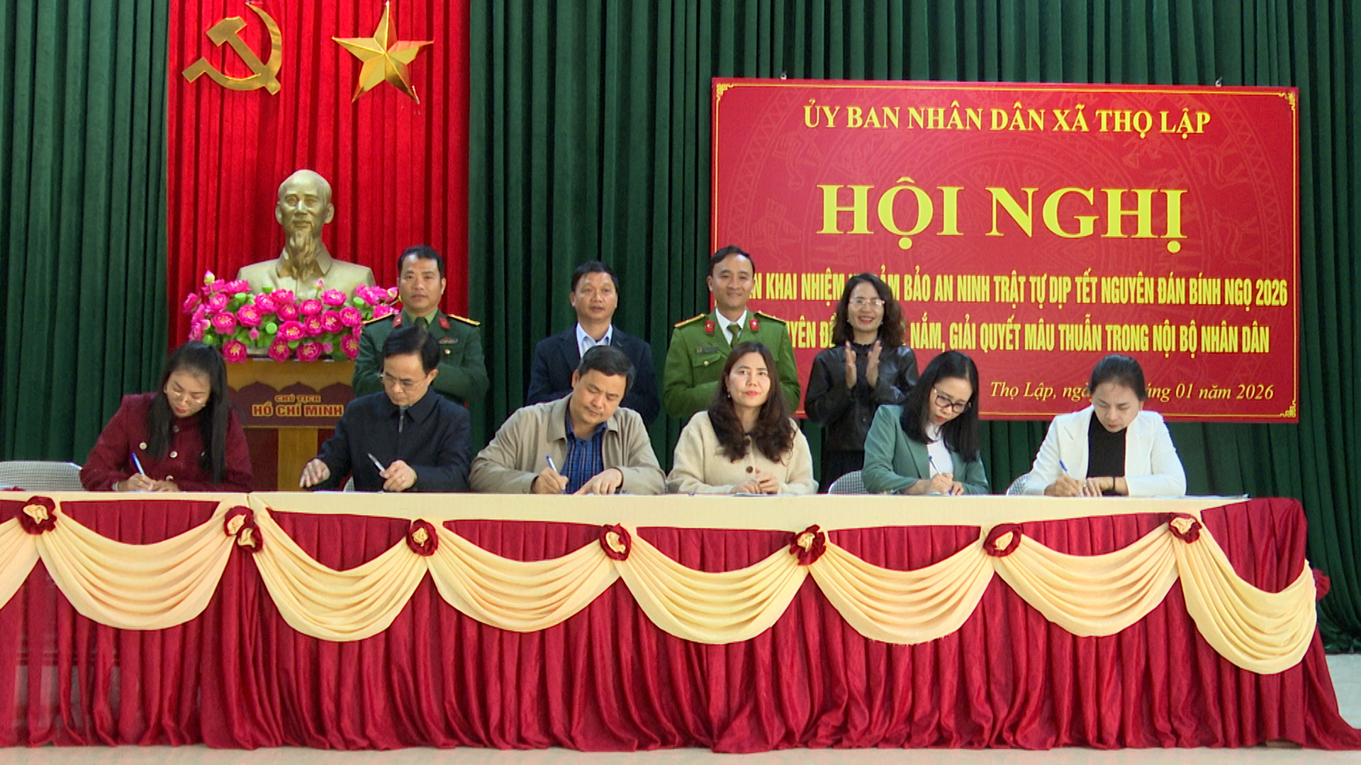 Tại hội nghị, đại diện các tổ chức chính trị- xã hội, các trường học và các thôn đã ký cam kết đảm bảo an ninh trật tự với Ủy ban Nhân dân xã Thọ Lập dịp trước, trong và sau tết Bính Ngọ 2026.