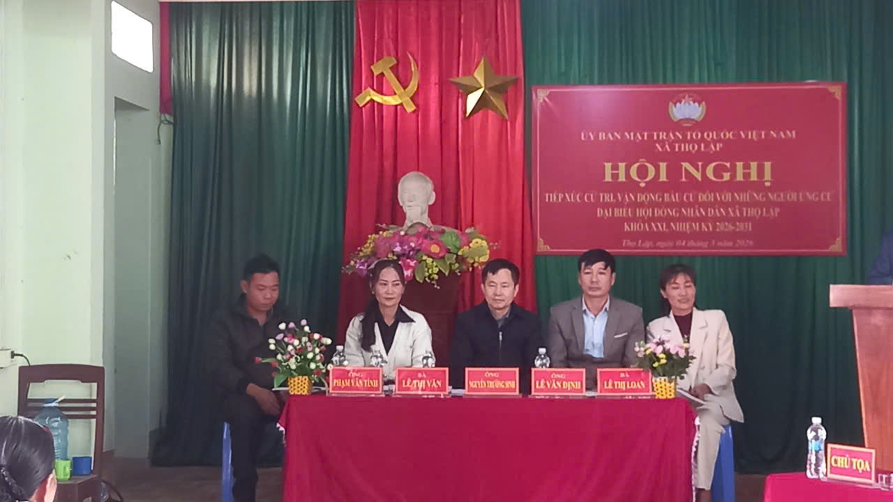 Chiều 4/3/2026, tại nhà văn hoá thôn 9, Ban Thường trực Uỷ ban MTTQ Việt Nam xã Thọ Lập tổ chức Hội nghị tiếp xúc cử tri, vận động bầu cử đối với 5 ứng cử viên đại biểu HĐND xã Thọ Lập khóa XXI, nhiệm kỳ 2026 - 2031, đơn vị bầu cử số 05 gồm các ông: Nguyễn Trường Sinh, Bí thư Đảng ủy, Chủ tịch HĐND xã; Lê Văn Định, Đảng ủy viên, Phó Trưởng ban Văn hóa - xã hội HĐND xã Thọ Lập; Lê Thị Loan, chi hội trưởng Chi hội Phụ nữ, Bí thư Chi đoàn thôn 11; Phạm Văn Tình, Bí thư Chi đoàn thôn 1 Phúc Bồi; Lê Thị Văn, Bí thư Chi bộ thôn 12.
