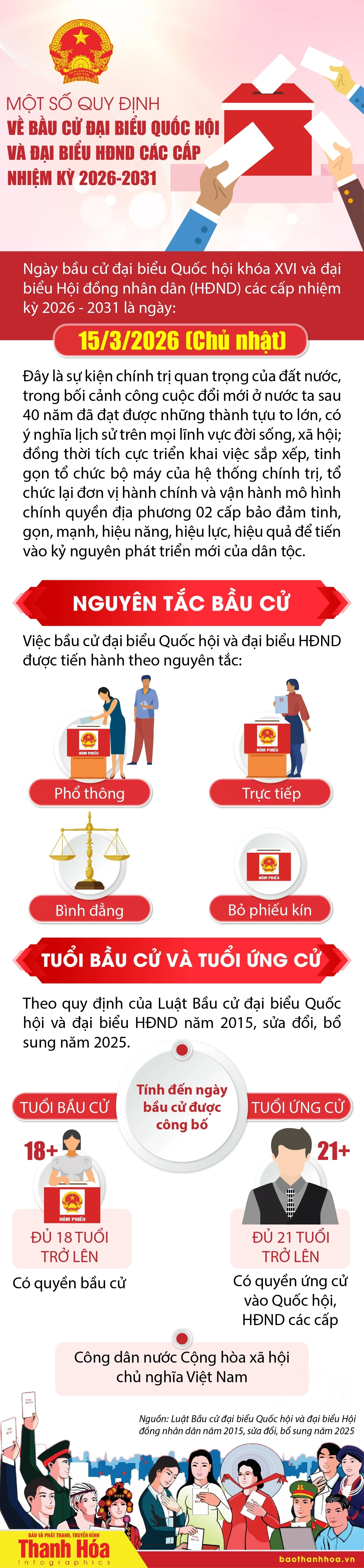 (Baothanhhoa.vn) - Trong không khí chuẩn bị cho ngày hội lớn của toàn dân, cuộc bầu cử đại biểu Quốc hội khóa XVI và đại biểu Hội đồng nhân dân các cấp nhiệm kỳ 2026–2031 đang được triển khai đồng bộ, chặt chẽ theo đúng quy định của pháp luật. Đây là sự kiện chính trị có ý nghĩa đặc biệt quan trọng, thể hiện quyền làm chủ của Nhân dân, đồng thời góp phần củng cố, hoàn thiện Nhà nước pháp quyền xã hội chủ nghĩa Việt Nam. Việc nắm vững các quy định về nguyên tắc bầu cử, độ tuổi bầu cử và ứng cử theo Luật Bầu cử năm 2015, sửa đổi, bổ sung năm 2025 là cơ sở để mỗi cử tri thực hiện đầy đủ quyền và trách nhiệm công dân của mình.